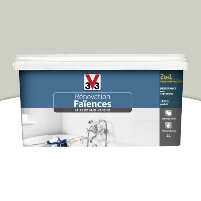 V33 colorissim gris galet (1). Peinture de haute technologie dotée d'une formule spéciale pigment plus assurant un pouvoir couvrant unique et un rendement élevé. Peinture cuisine et salle de bains, coloris bleu gris sapin, protège de l'humidité et des graisses, lessivable, 11 teintes standard (satin, mat),1170 teintes en machine à teinter plus d'infos :